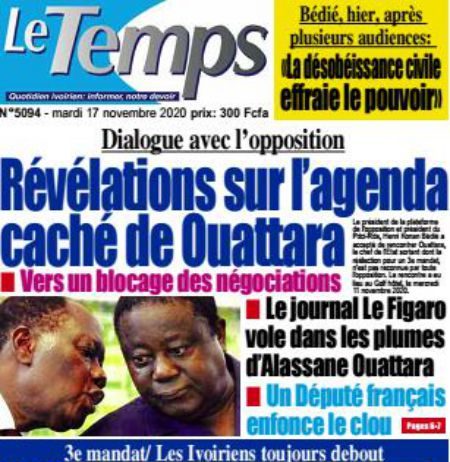 Les unes des principaux quotidiens ivoiriens du mardi 17 novembre 2020