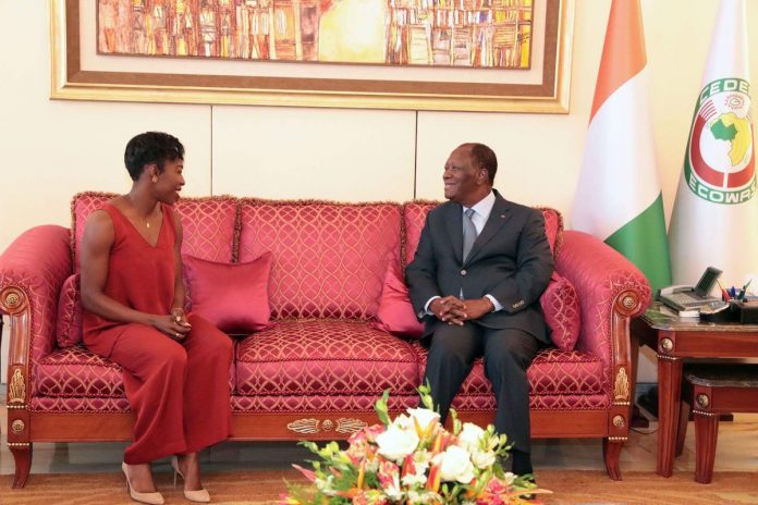 Le lundi 19 mars 2018, Murielle Ahouré, championne du monde des 60 mètres en salle a présenté au palais présidentiel sa médaille au présente Alassane Ouattara. A cette occasion, le numéro Ivoirien s’est exprimé et a salué la victoire de la fille de Bassam.