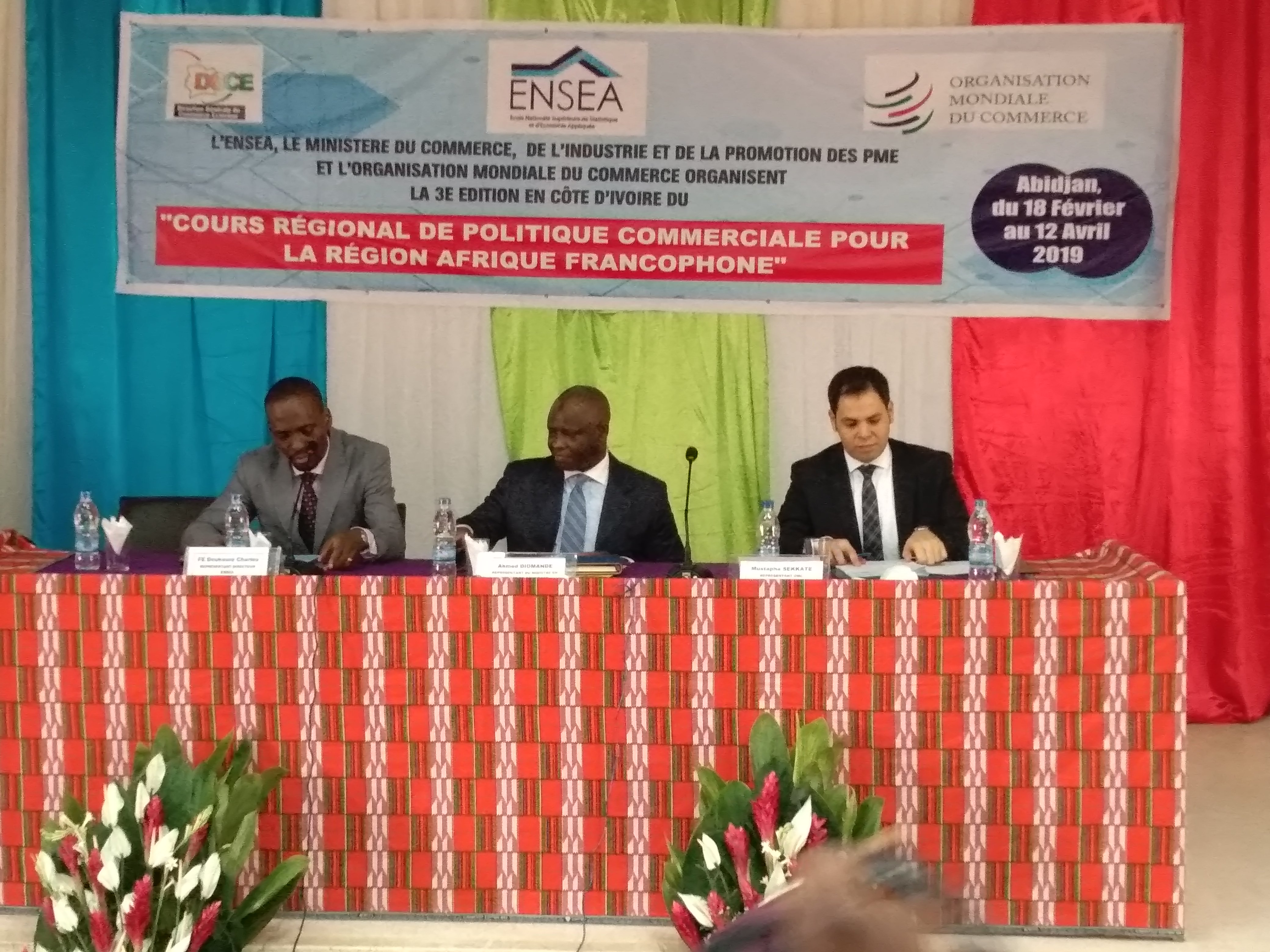 Ahmed Diomandé , Directeur de Cabinet Adjoint du ministre du commerce et de la promotion des PME, a procédé ,en présence de Mustapha SEKKATE ,représentant du Directeur de l’organisation Mondiale du Commerce( l’OMC) ,à l’ouverture officielle de l’édition 2019 du Cours Régional de Politique Commerciale pour la Région Afrique Francophone ( CRPC) , ce lundi 18 février 2019 au sein de l’Ecole Nationale Supérieure de Statistique et d’Economie Appliquée ( l’ENSEA d’Abidjan).