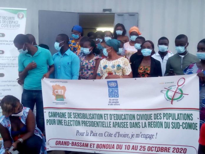 Le 31 octobre 2020 la côte d’Ivoire écrira une page très importante de son histoire et cela du fait des élections présidentielles. Etant donné les circonstances électorales qui sont émaillées de violences et consorts, le REPSFECO-CI avec le soutien du PNUD envisage contribuer à une Élection présidentielle inclusive, pacifique et non violente. Ainsi, pour ce faire il compte renforcer les capacités des parties prenantes c’est à dire femmes, jeunes, medias locaux et leaders communautaires sur le processus de vote:<< Pourquoi et comment voter >>. Pour être plus pratique, un atelier de formation des animateurs de Sensibilisation terrain, des femmes et des jeunes leaders des hommes de media locaux et des leaders communautaires a eu lieu au centre social de Grand-Bassam ce mardi 13 octobre 2020. Il s’agissait de leur donner les moyens techniques pour contribuer à un processus électoral inclusif, libre, crédible, transparent et non violent.