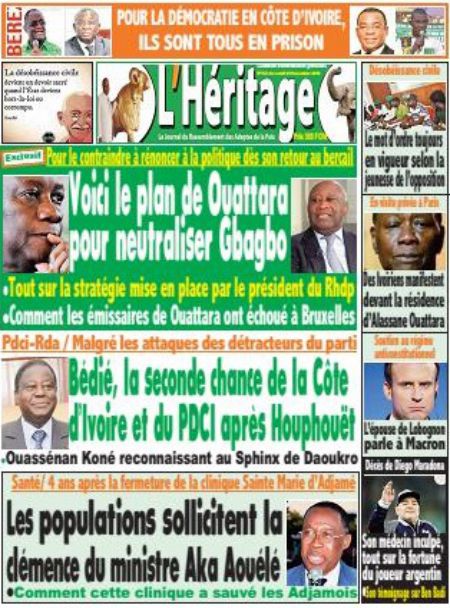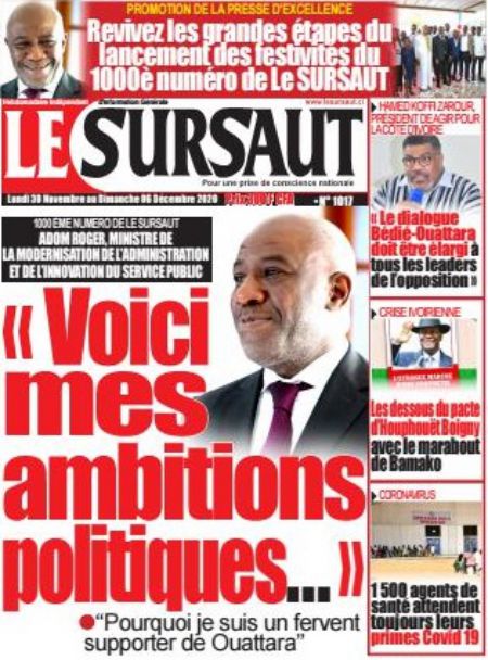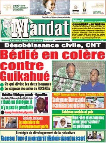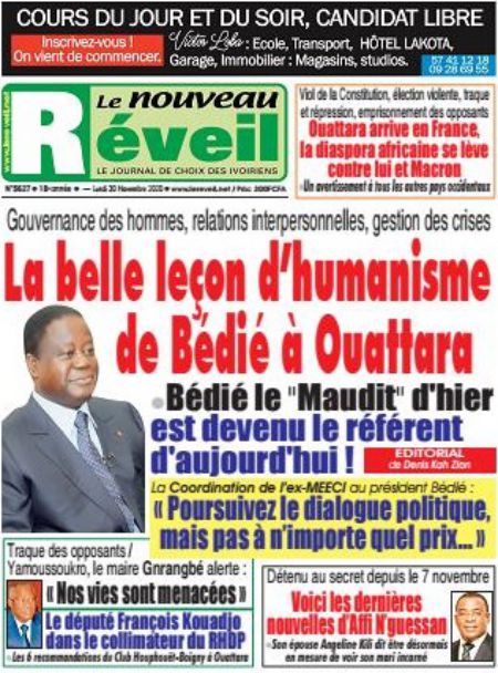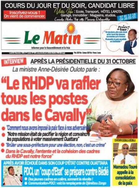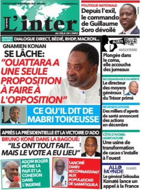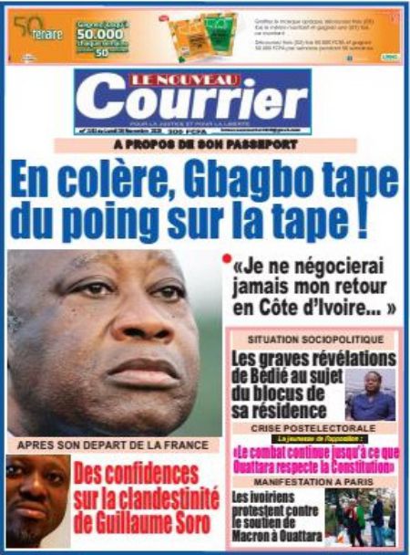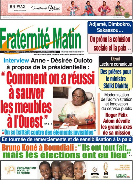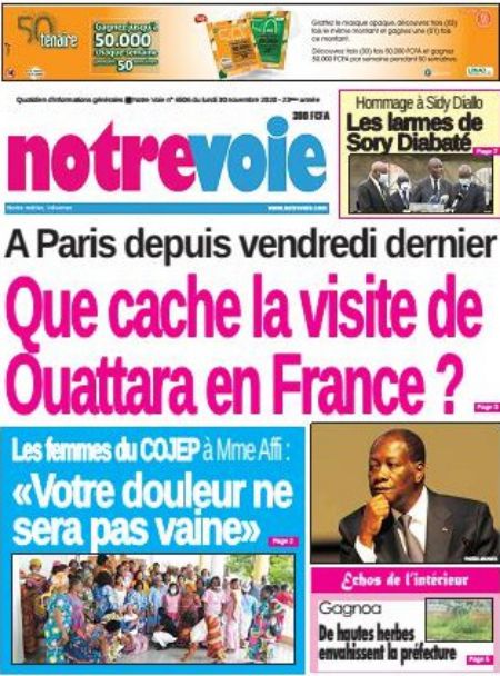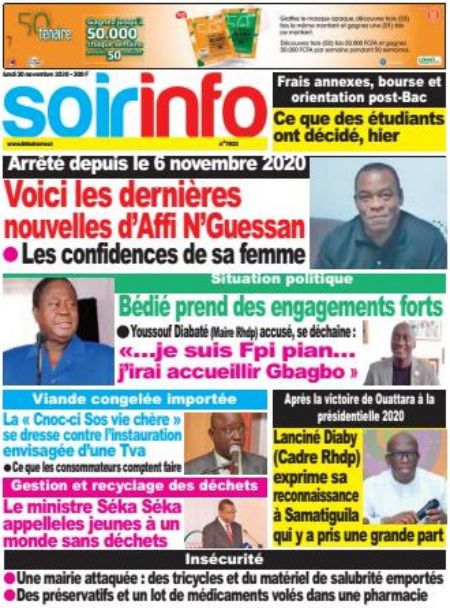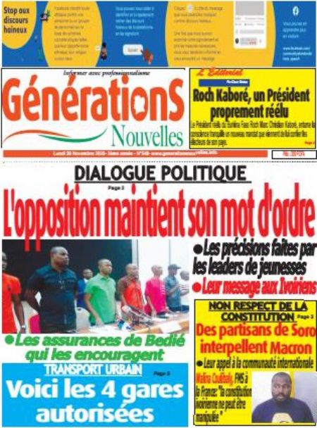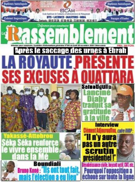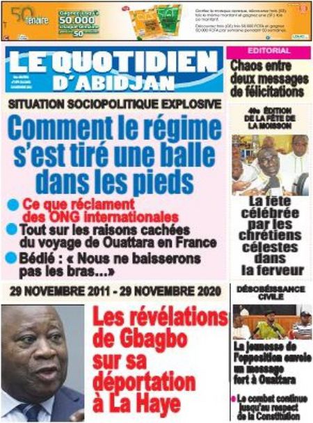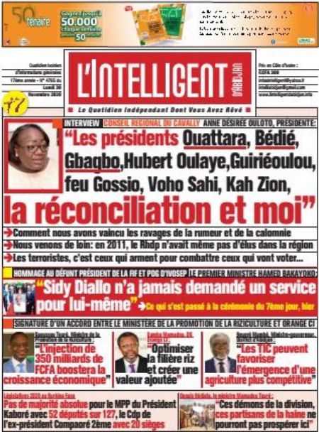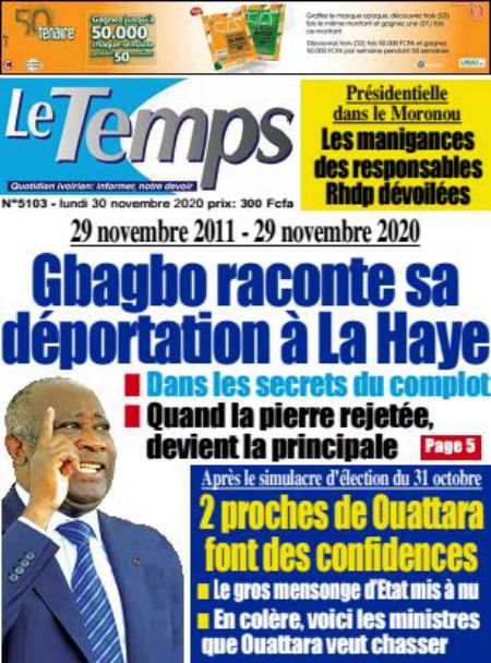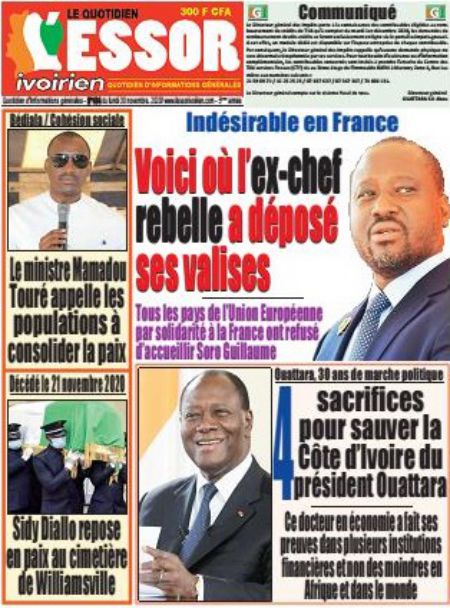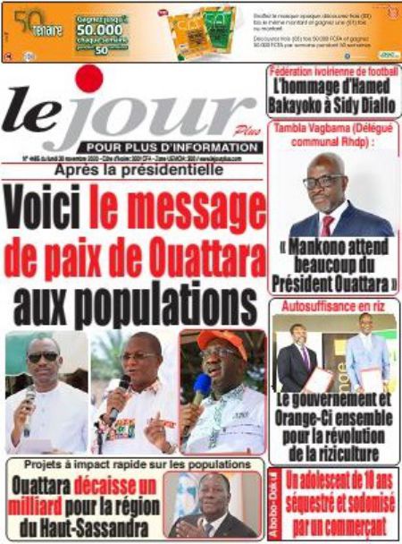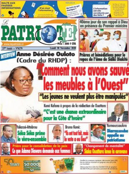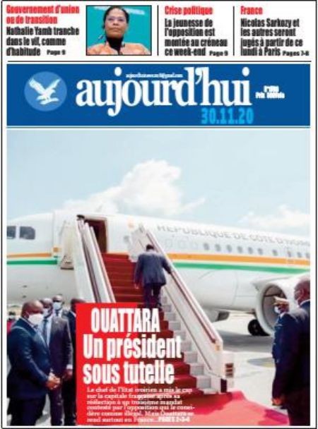 Politique La revue des titres de la presse ivoirienne : les unes des principaux quotidiens du lundi 30 novembre 2020 Par Carlo Symphonie - 30/11/2020 0 544 Partager sur Facebook Partager sur Twitter