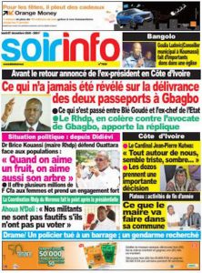 Politique Côte d’ivoire : Les unes des journaux du lundi 07 décembre 2020 Par - 07/12/2020 0 595 Partager sur Facebook Partager sur Twitter