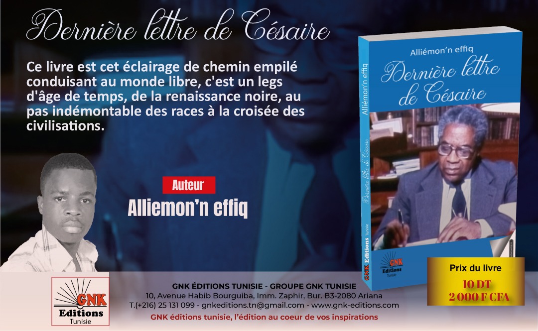 L’étudiant ivoirien basé à Tunis depuis plusieurs années vient en effet de publier une exquise galette intitulée » Dernière Lettre de Césaire ».Un chef-d’œuvre de 50 pages paru aux GNK Éditions Tunis ce 15 décembre .Jeune auteur élevé à la sève de la littérature négro-africaine,un mouvement dont il se réclame ,Alliémon’n Effiq entend apporter sa contribution à l’édification de la nouvelle anthologie culturelle.