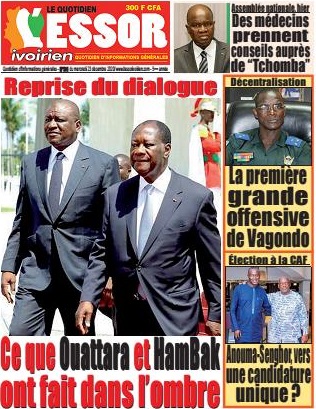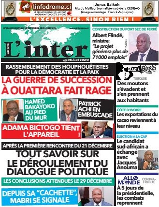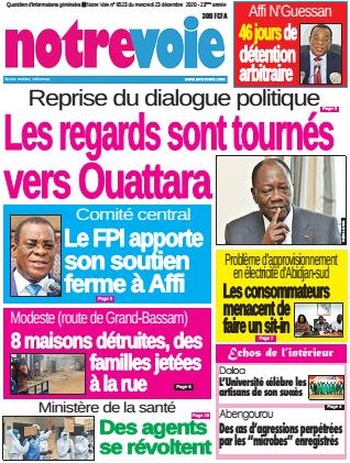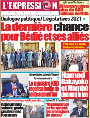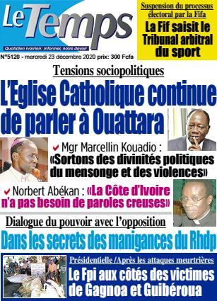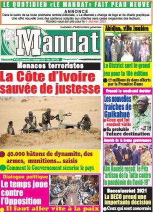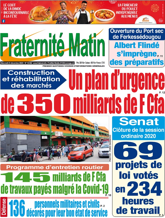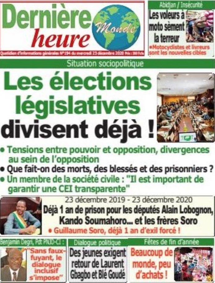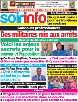 Politique Revue des titres de la presse ivoirienne : Tensions entre pouvoir et opposition! Que fait-on des morts, des blessés et des prisonniers? Par Carlo Symphonie - 23/12/2020 0 713 Partager sur Facebook Partager sur Twitter Construction et réhabilitation des marchés…………………………………….. PARTAGER Facebook Twitter tweet Article précédentTitrologie des journaux ivoiriens : Qu’est ce qui a dégradé si rapidement la santé de Guikahué?…. des révélations inquiétantes sur son étatArticle suivantGRAND-BASAM / Fête de fin d’année : Mobilisation exceptionnelle autour des orphelinats privés. Carlo Symphoniehttp://www.infoline.ci