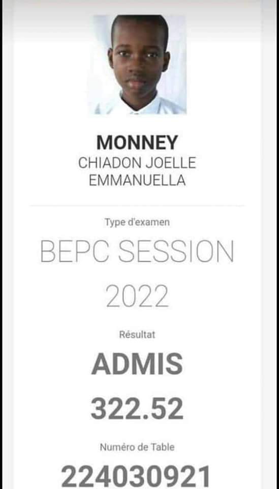 Elle s’appelle MONNEY CHIADON JOELLE EMMANUELLA. Elle est admise au BEPC 2022. Elle a eu 322,52/360 points dans ce BEPC avec caméra, drone, Détecteur de portables et autres mesures contraignantes. Elle mérite aussi d’avoir le BUZZ, elle mérite que MTN, Orange, Moov lui fasse un clin d’œil, elle mérite d’être sur les plateaux télé. Félicitation à toi Monney Chiadon, continue!