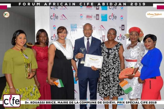 Au cours du diner gala organisé par le Conseil International des Femmes Entrepreneures ( CIFE), ce mercredi 27 février 2019 au Sofitel hôtel Ivoire à Abidjan, un seul homme parmi les dames a été distingué pour son engagement au côté de la femme en côte d’ivoire. Il s’agit de BRICE KOUASSI,le Maire de la commune de Didiévi. La seule commune ivoirienne qui a trois adjoints au maire, dont 02 femmes et 01 homme.