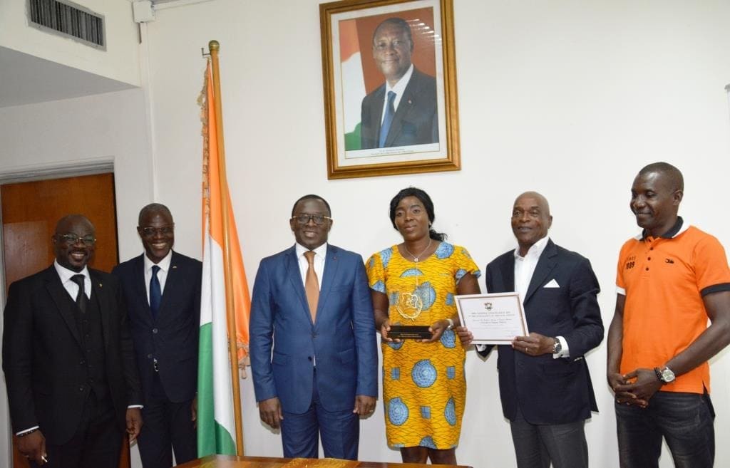 Absent, l’honneur est revenu à sa mère, Josiane Kouamé de recevoir le trophée du prix d’excellence des mains du ministre des Sports, Claude Danho Paulin, dans la salle de conférence du Ministère des Sports au Plateau, ce mercredi 19 février 2020. En plus du trophée, le jeune tennisman a également reçu un diplôme et une enveloppe de 1.500.000 FCFA.