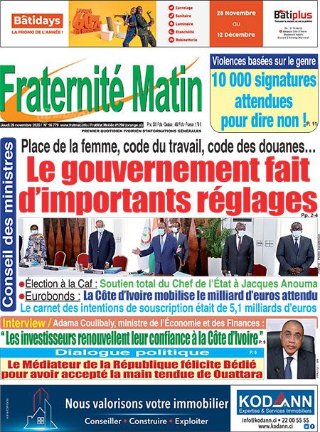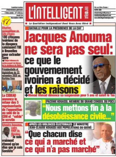 Politique Revue des titres de la presse ivoirienne du jeudi 26 novembre 2020 Par Carlo Symphonie - 26/11/2020 0 591 Partager sur Facebook Partager sur Twitter