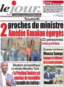 Politique Presse ivoirienne/ revue des titres du jour : le quotidien le jour , deux proches du ministres Amédée Kouakou égorges Par - 10/12/2020 0 560 Partager sur Facebook Partager sur Twitter