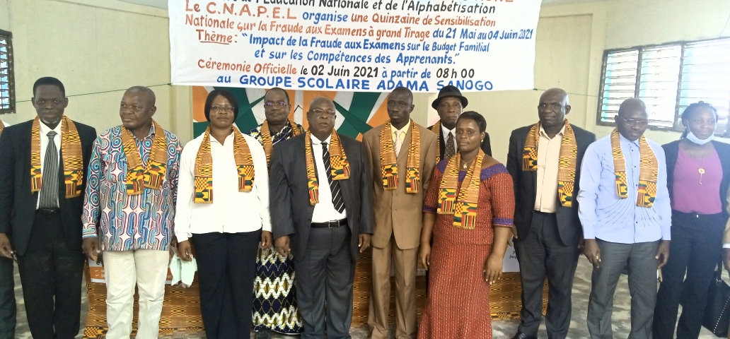 En raison de la montée du phénomène de triche aux examens à grands tirage ces dernières années ( en 2017 ,383 cas de fraudes ; en 2018 , 1516 cas de fraudes ; en 2019, 6833 cas de fraudes ; en 2020 ,16.428 cas de fraudes) , le Conseil National des parents d’élèves de l’enseignement privé Laïc de Côte d’Ivoire (CNAPEL), a pris les devants en organisant la cérémonie de lancement officiel de la journée nationale de sensibilisation sur la fraude aux examens à grand tirage ce mercredi 2 juin 2021, au groupe scolaire Adama Sanogo , Abidjan- Dokoui.