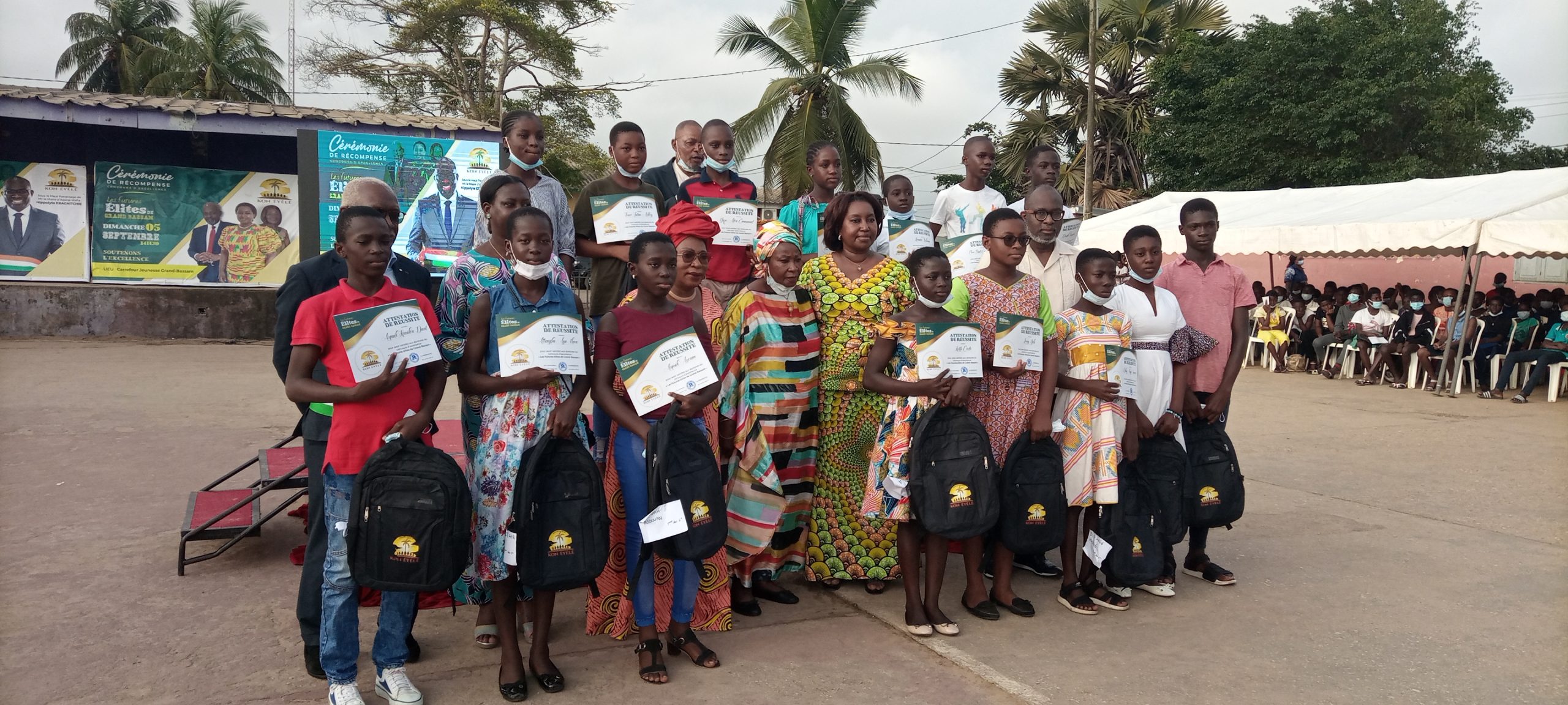 La 1ere édition des futures élites de Grand Bassam récompensant les plus méritants de l’ancienne capitale ivoirienne des niveaux 6e ,5e et 4e s’est tenue le dimanche 5 septembre 2021 au carrefour jeunesse de Grand Bassam totalement plein de monde. Présidée par le maire d’Assinie Hyppolite Egbagnitchi, l’édition a enregistré la participation des cadres N’Zima ,des bénévoles de l’association Kon êyêlê de Grand Bassam, les élèves , les parents d’élèves , les autorités administratives, politiques, coutumières de la cité balnéaire et la sénatrice du Sud-Comoe. Ce sont au total 15 élèves qui ont été récompensés c’est-à-dire 5 élèves par niveau ( 6e , 5e et 4e). Ils ont reçu des prix composés de cartables contenant des dictionnaires anglais-Français où le Bescherelle d’une prise en charge des cours pour l’année scolaire 2021-2022. Me Linda Diplo présidente l’association Kon êyêlê initiatrice du concours d’excellence dénommé les futures élites a fait la genèse du parcours des lauréats du concours d’excellence. « le collège Robert Léon a abrité le concours d’excellence. Les conditions pour être retenus pour le concours c’est 12/20 de moyens obtenu en classe au cours de l’année scolaire. Pour cette édition les élèves ont composés en deux tours dans les matières suivantes : Français, Mathématiques et EDHC. Ainsi, nous pouvons, féliciter les enfants qui a l’entame du concours étaient 244 élèves inscrits. Après quelques désistements 213 candidats se sont finalement présentés aux épreuves. Au terme du concours d’excellence nous pouvons noter que la performance de nos enfants de 6e qui a 45,9% soit près de la moitié d’entre eux ont obtenu le minimum de 12/20 requis pour continuer la composition. Ces derniers sont suivis des 21 élèves de 5e et des 16 élèves de 4e eux aussi retenus et qui représente 27,6% et 25,3% des candidats en lice au premier tour. A la suite des épreuves du second tour nous avons retenu les 5 premiers de chaque niveau. Ainsi , nous avons retenu les 15 méritants. Ainsi, ces performances sont encourageantes et à féliciter c’est pourquoi nous donnons en plus des récompenses nous ajoutons des bons d’achats qui leur permettront d’acquérir des fournitures scolaires des uniformes et des tenues de sport. Aussi, Me Linda Diplo a félicité les parents d’élèves les bénévoles de Kon êyêlê pour le travail abattu avant d’inviter les lauréats à la persévérance. « Vous êtes désormais comme des lampions qui doivent se maintenir toujours allumés en permanence pour guider les générations à venir. » a-t-elle exhorté. Quant au parrain de l’édition Hyppolite Egbagnitchi a partagé son expérience en rappelant son parcours . A ses filleuls Hyppolite Egbagnitchi a conseillé la culture de l’excellence.